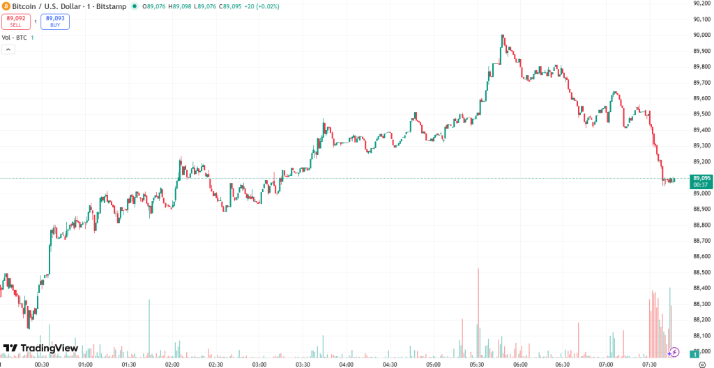 Bitcoin (BTC) впала на 2,2% і нижче 90 000 дол. Зараз він торгується на рівні 89 104 доларів США.